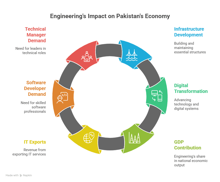 Pakistan would not be going anywhere without the engineers who build its infrastructure, develop and transform it as well as digitize it. As stated by Pakistan Engineering council, the engineering services also bring about about 5 percent of the GDP, and IT exports exceeded 3 billion dollars last year, thus creating great demand of software developers, and technical managers.