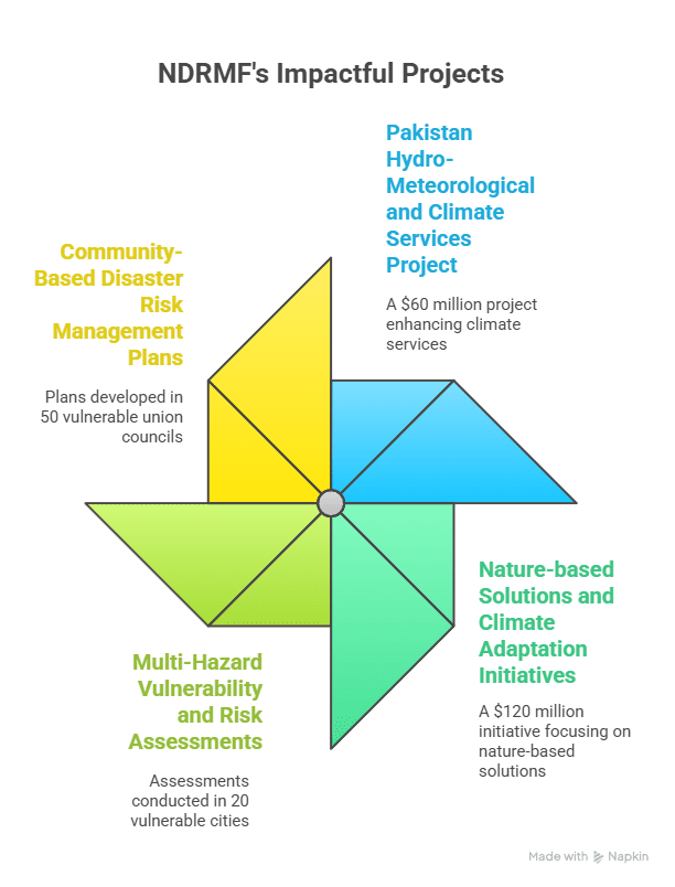 NDRMF ever since its inception in 2014, has been providing grant funding to many high-value projects such as Pakistan Hydro-Meteorological and Climate Services Project ($60 Million) and Nature-based Solutions and Climate Adaptation initiatives ($120 Million).