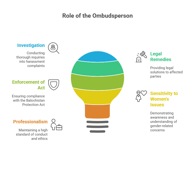 Ombudsperson is founded on a detailed legal framework that has been put in place by the Protection Against Harassment of Women at Workplace Act of 2010, which was subsequently amended and adopted at the province level by the acts of Balochistan Protection Against Harassment of Women at Workplace 2016.