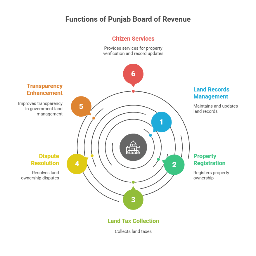 The chief land revenue board in the province is Punjab board of revenue. It keeps land records, registers property and collects land tax. Another role of the department is to solve disputes over land ownership and this is done through a legal process. It is instrumental in the aggravation of transparency of government lands. The citizens get to use this office to verify properties and update records.