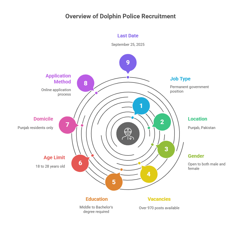 The Dolphin Police hires on a permanent basis and provides medical as well as pensions and training. There are several openings both among men and women in Punjab. Various posts may be sought by those candidates who have Matric, Inter or Bachelor. Apply online on or before 25 September 2025 and start your law enforcement career.