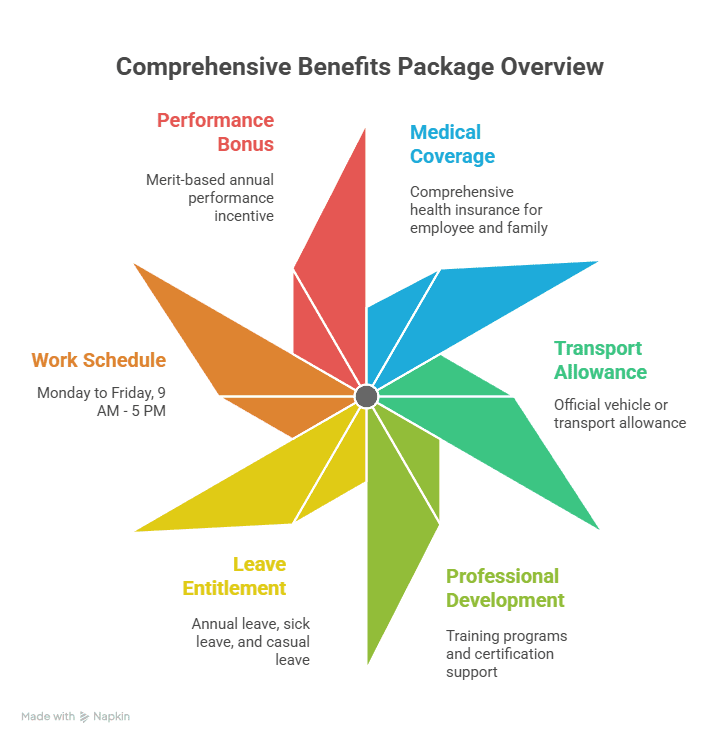 | Transport Allowance | Official vehicle or transport allowance | PKR 50,000 – 80,000 monthly |